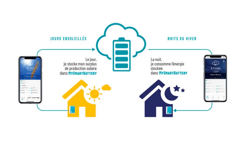 L’électricité que vous produisez et qui ne peut pas être consommée directement sera stockée dans votre batterie cloud. Le soir, lorsque votre installation solaire ne produit plus mais que vous consommez, MySmartBattery vous permet de récupérer cette énergie verte et de la consommer en temps réel, lorsque vous en avez besoin ! De la même façon, votre surplus d’été pourra être utilisé l’hiver ! Très simplement, l’énergie solaire produite sera comptabilisée par votre coffret connecté à vos panneaux solaires et vous pourrez la réutiliser sans devoir la racheter.